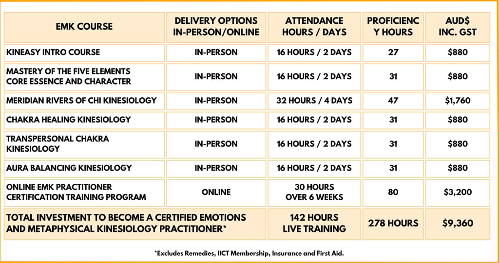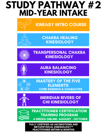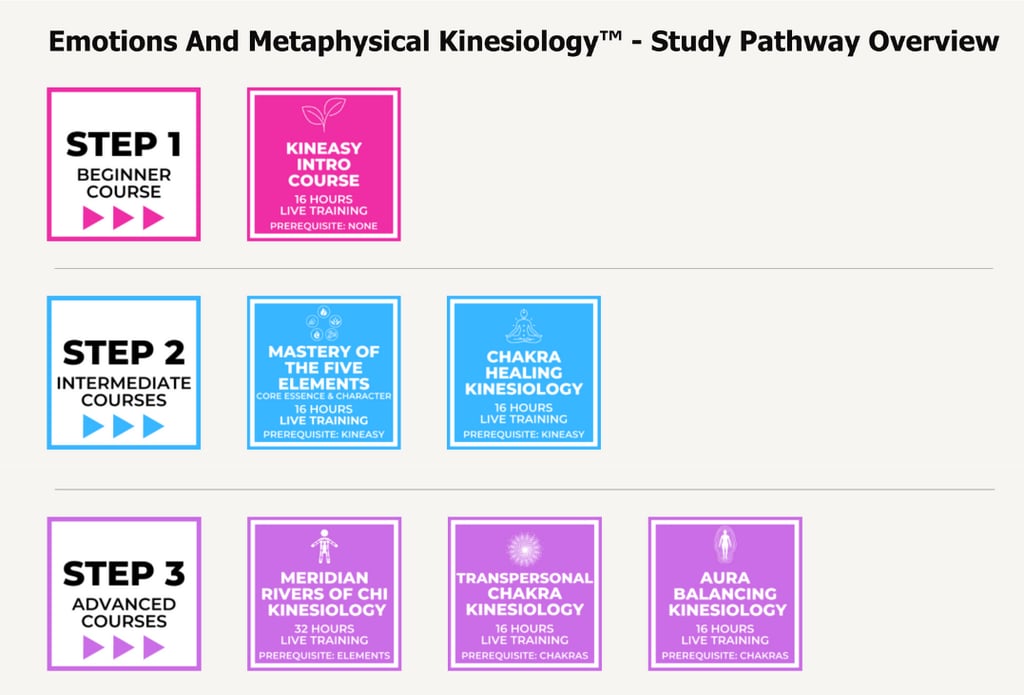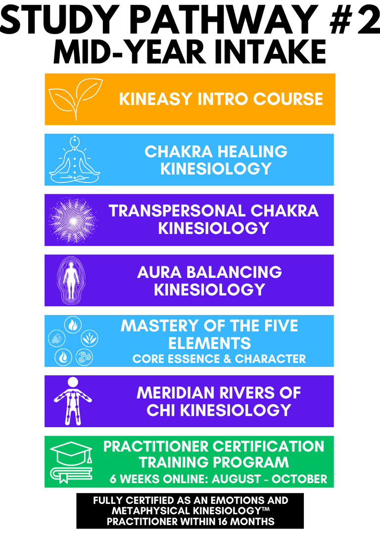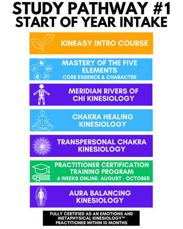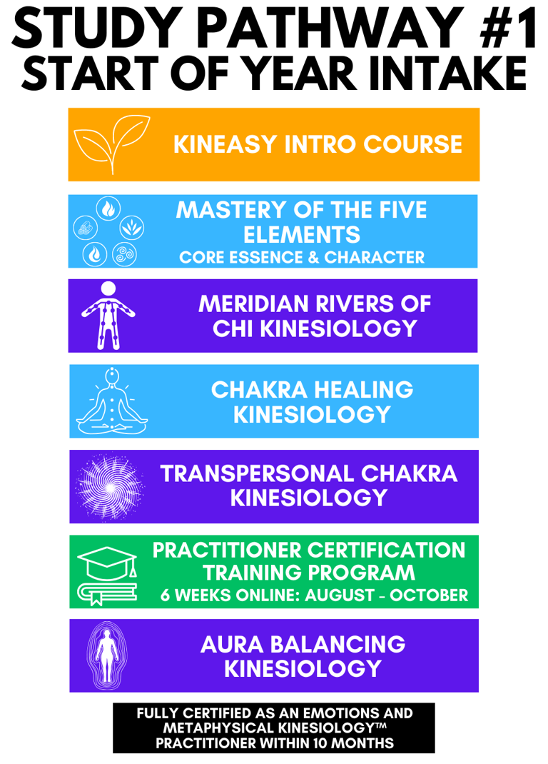 Below you’ll find your starting point, the full EMK Study Pathway and the recommended timeline to becoming a fully qualified and certified Emotions and Metaphysical Kinesiology™ Practitioner, eligible for IICT membership and professional insurance.